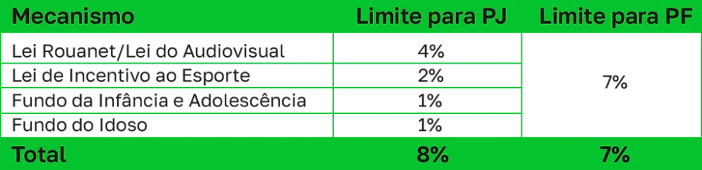 As pessoas físicas que fazem a Declaração de Imposto de Renda Completa podem doar até 6% do IR (imposto de renda). Assim elas podem desfrutar da dedução ou do aumento do valor a restituir. Já as pessoas jurídicas (empresas) que tenham Imposto de Renda a pagar, cujo resultado tenha sido apurado com base no Lucro Real serão concedidas com esse benefício e podem doar até 9% do seu imposto. A apuração do Lucro Real pode ser trimestral ou anual.